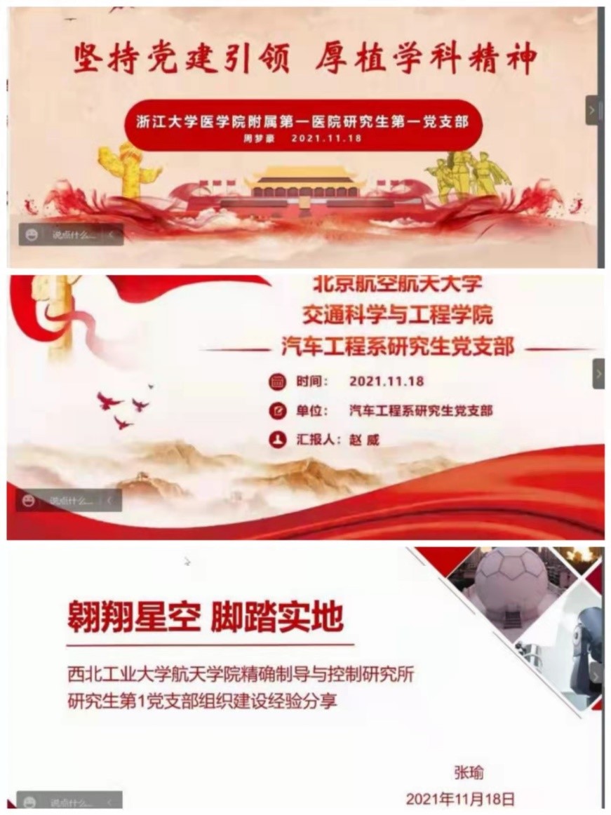 首先,三位副书记分别为此次共建活动致辞,对来自不同学校的同学表示欢迎,希望各位学生党员深入学习贯彻党的十九届六中全会精神,交流各自支部的建设经验,通过学习借鉴进一步提升支部建设水平。我院董士涵同学,浙大林贤添同学,北航赵威同学作为各支部学生代表,从工、医、信专业出发,汇报了对党的十九届六中全会精神的学习心得。接下来,进行支部典型工作案例交流,我院张瑜同学以微小卫星团队事迹结合支部活动,对精确制导与控制研究所研究生第1党支部进行了介绍。浙大周梦豪同学以李兰娟院士团队事迹结合支部实践活动,对浙江大学医学院附属第一医院研究生第一党支部进行了介绍。北航赵威同学以支部汽车工程团队在变速器方面取得的成就结合支部建设活动,对北京航空航天大学交通科学与工程学院汽车工程系研究生党支部进行了介绍。大家在支部工作上相互借鉴、相互启迪。