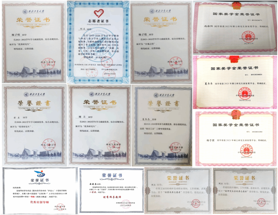 育栋梁之才:得益于团队提供的教学资源,目前,在读学生超半数位于专业/年级前5,3人位于专业/年级第一,3人获得国家奖学金、20余人次获单项奖学金、优秀研究生等荣誉。团队指导教师岳晓奎教授荣获2023年国家教学成果二等奖,目前在读研究生累计获得包括2022年“互联网+”创新创业大赛国赛银奖、2023年“挑战杯”科技作品竞赛全国一等奖等在内的各类竞赛获奖十余项,团队以学科竞赛为依托,实现实践创新型人才培养。在过去5年,团队培养的研究生担任型号总师/副总师5名,88%以上毕业学生进入航空航天领域重要科研院所,为国家国防事业持续输送科研人才!