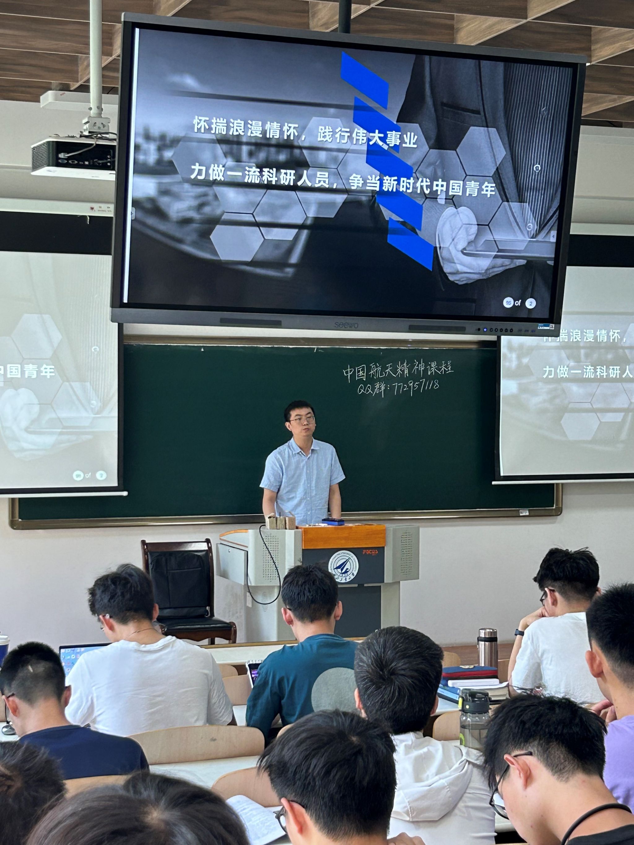 5月17日上午,pg游戏电子模拟器课程思政研究中心邀请了中国航天科技集团八院八部某型号副总设计师许新鹏高工,在长安校区教学东楼B1-205教室为pg游戏电子模拟器特色课程《中国航天精神》带来了主题为“怀揣浪漫情怀,践行伟大事业,力做一流科研人员,争当新时代中国青年”的总师思政课程。