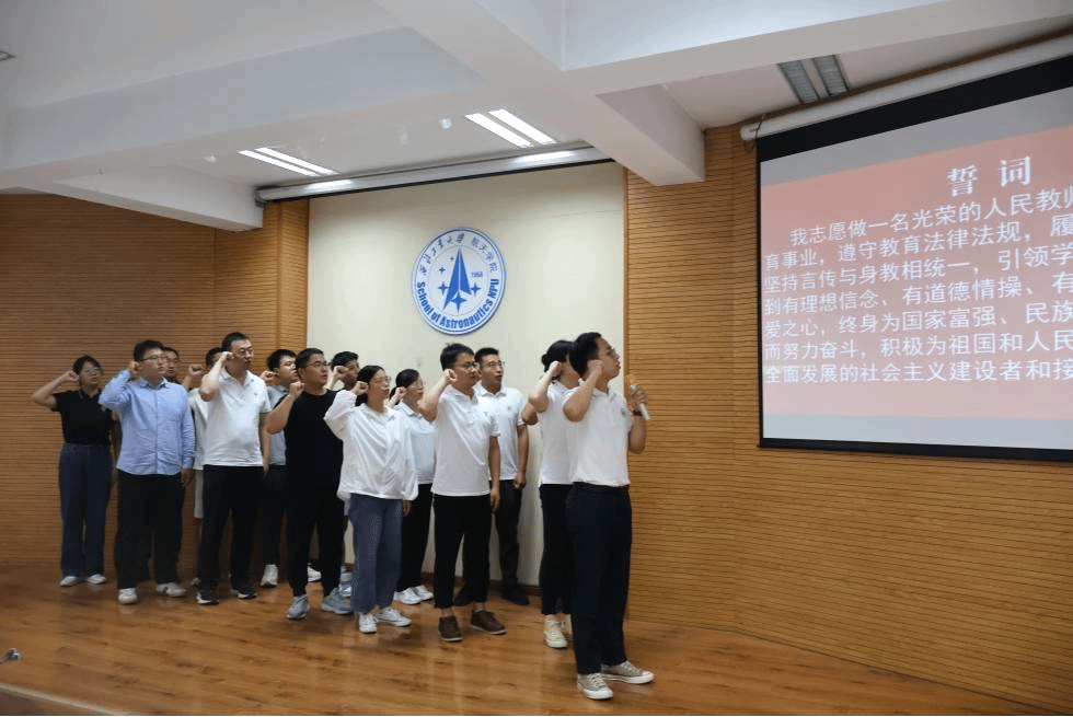 会上,学院为新入职的教师代表们举行了入职宣言仪式,在新入职教师代表张凡领誓下,共同许下对教育事业的忠诚誓言。原pg游戏电子模拟器院长唐硕、学院院长黄攀峰共同为新入职教师赠送了我国航天事业和航天教育的开拓者与奠基人之一,著名飞行力学专家、教育家,学校宇航工程系创始人陈士橹院士的传记《剑指苍穹》。希望新入职教师们能学习前辈们爱岗敬业、治学严谨的精神,将那份对教育的热爱转化为对工作的责任、对学生的关怀,为学院的发展注入新活力。