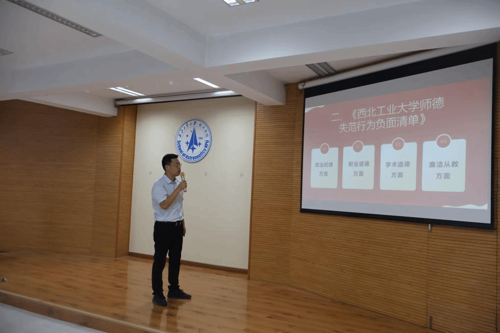 接下来,韩冬副书记带领与会教师学习了中共中央国务院最新颁布的《关于弘扬教育家精神加强新时代高素质专业化教师队伍建设的意见》精神,重温了《新时代高校教师职业行为十项准则》、《西北工业大学师德失范行为负面清单》。通过重温师德规范,引导教师进一步自我审视,自我提升,共同营造一个风清气正、和谐向上的教育环境。