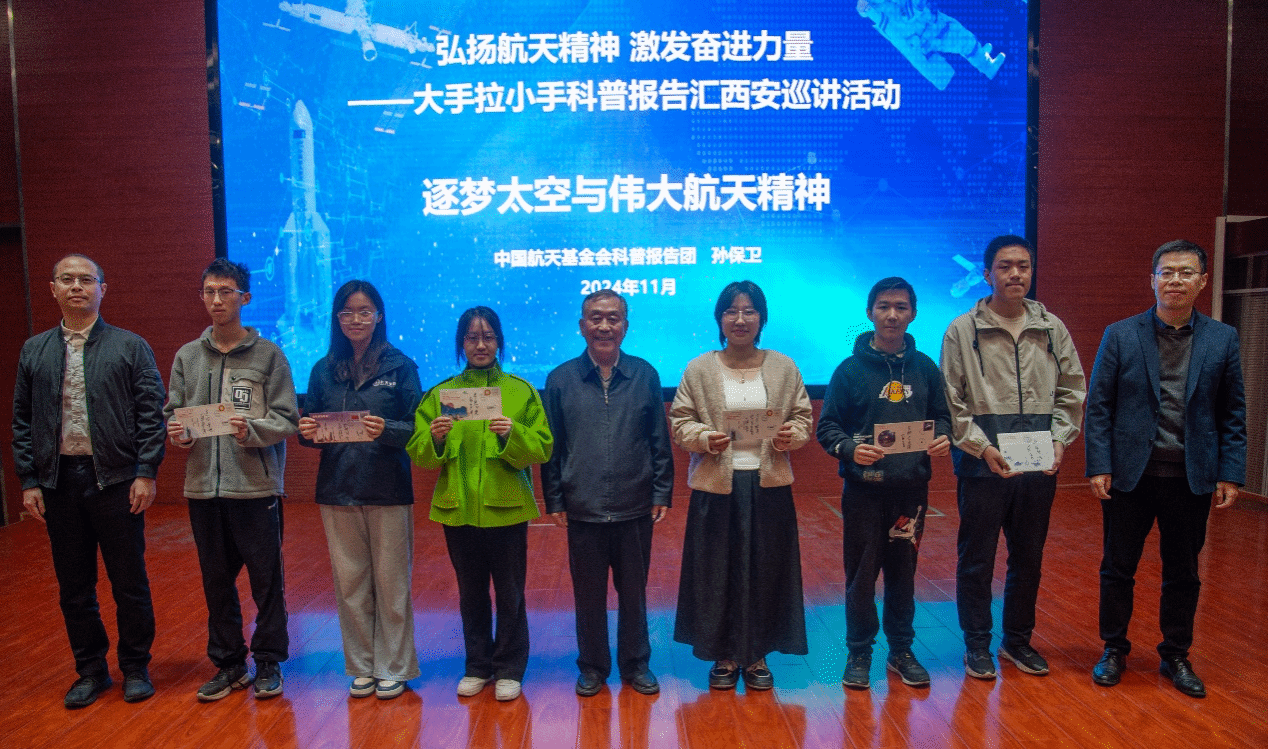 讲座最后,同学们积极分享了自己的学习感悟与体会,孙保卫耐心细致地解答了同学们的问题,并对我校学生良好的学习态度表示赞赏,向学生代表赠予了亲笔签名的航天日首日封。集体合影后,本次报告会在热烈的掌声中圆满结束。