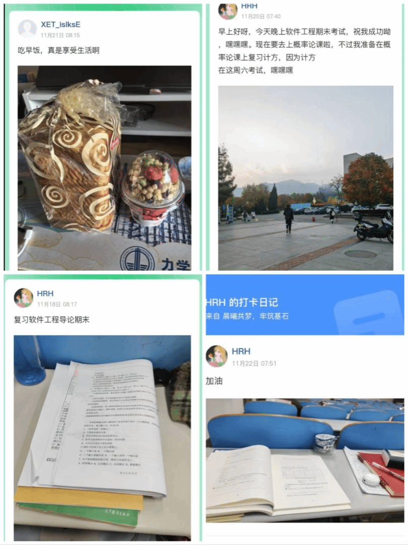 在线下活动正式开始之前,进行了为期一周的“晨曦共梦,牢铸基石”预热打卡活动。同学们怀揣着对健康生活的热忱期许,秉持着自律的生活态度,纷纷加入了这场打卡新一天美好早晨的行动。在微信小程序“鹅打卡”平台上,满是同学们生活的生动剪影:有精心准备的营养早餐,有学习时的温暖鼓励,还有记录活力瞬间的运动影像。晨曦微光中,同学们以自律为笔,以坚持作墨,书写着属于自己的健康生活篇章,在日复一日的打卡里,逐步勾勒出规律作息的轮廓。