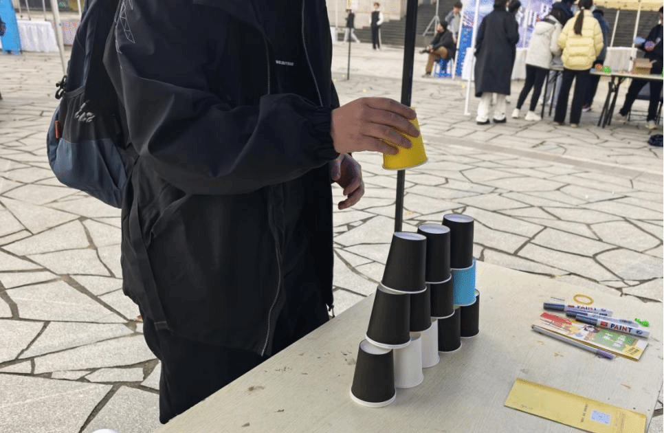 在这片洋溢着活力的场地之中,同学们两两一组,共同参与这场紧张刺激又充满乐趣的接力挑战——搭建一座精心设计的五层纸杯塔。同学们全神贯注,小心翼翼地摆放。过程中,纸杯塔或摇摇欲坠,引得众人屏息凝神,或在精准配合下层层拔高、稳固挺立。在一递一接、一搭一补中,同学们跨越了个人能力的 “孤岛”,感受到了团结协作的意义。