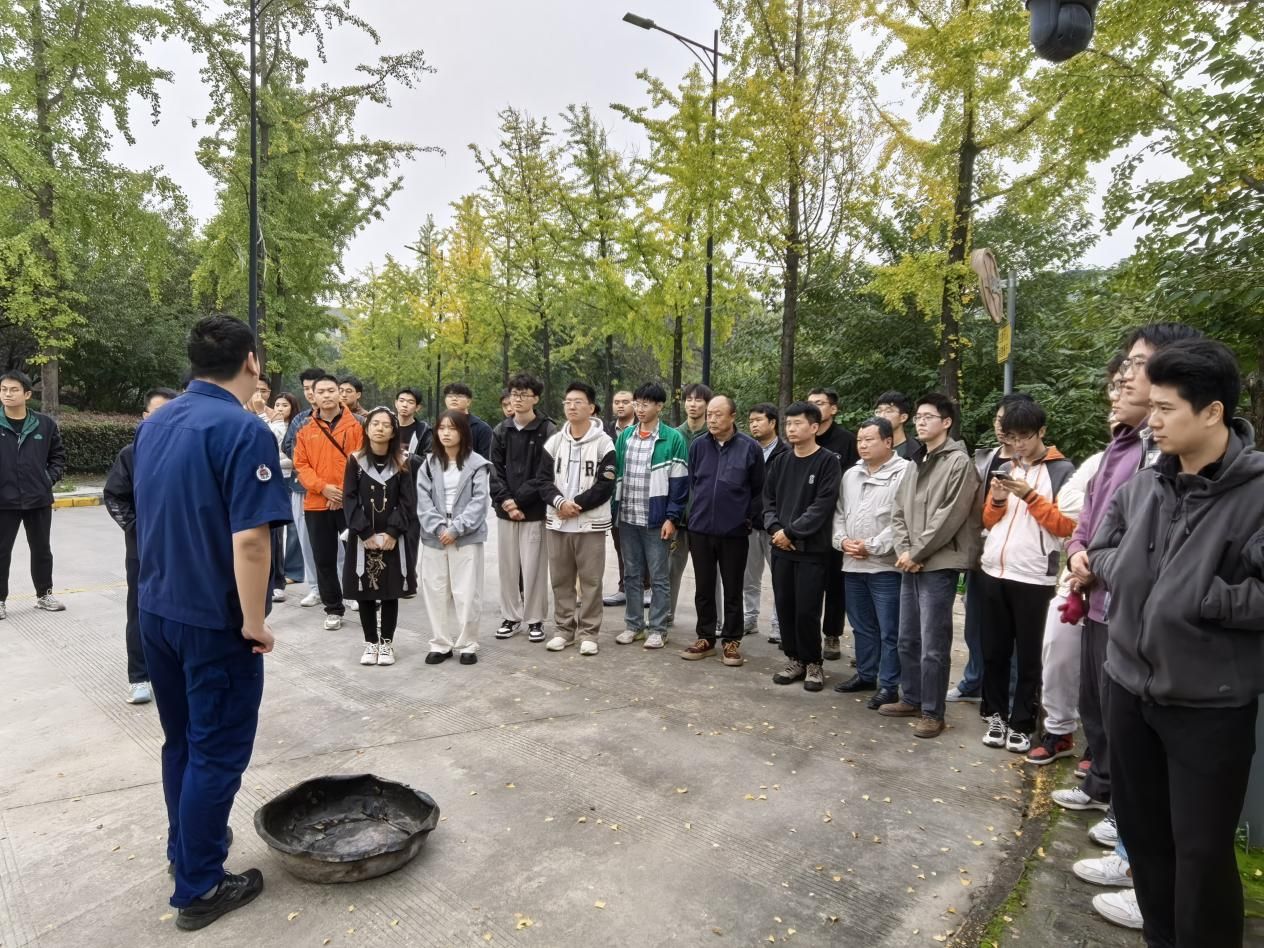 许老师为在场师生进行消防知识讲解和消防器材演示。举例介绍学校往期发生在实验室和宿舍的消防安全事故,强调宿舍里要注意高功率电器的规范使用、实验室内要注意危化品的存放要求。叮嘱师生在遇到火情时,要及时切断电源,并优先保证自身人身安全。