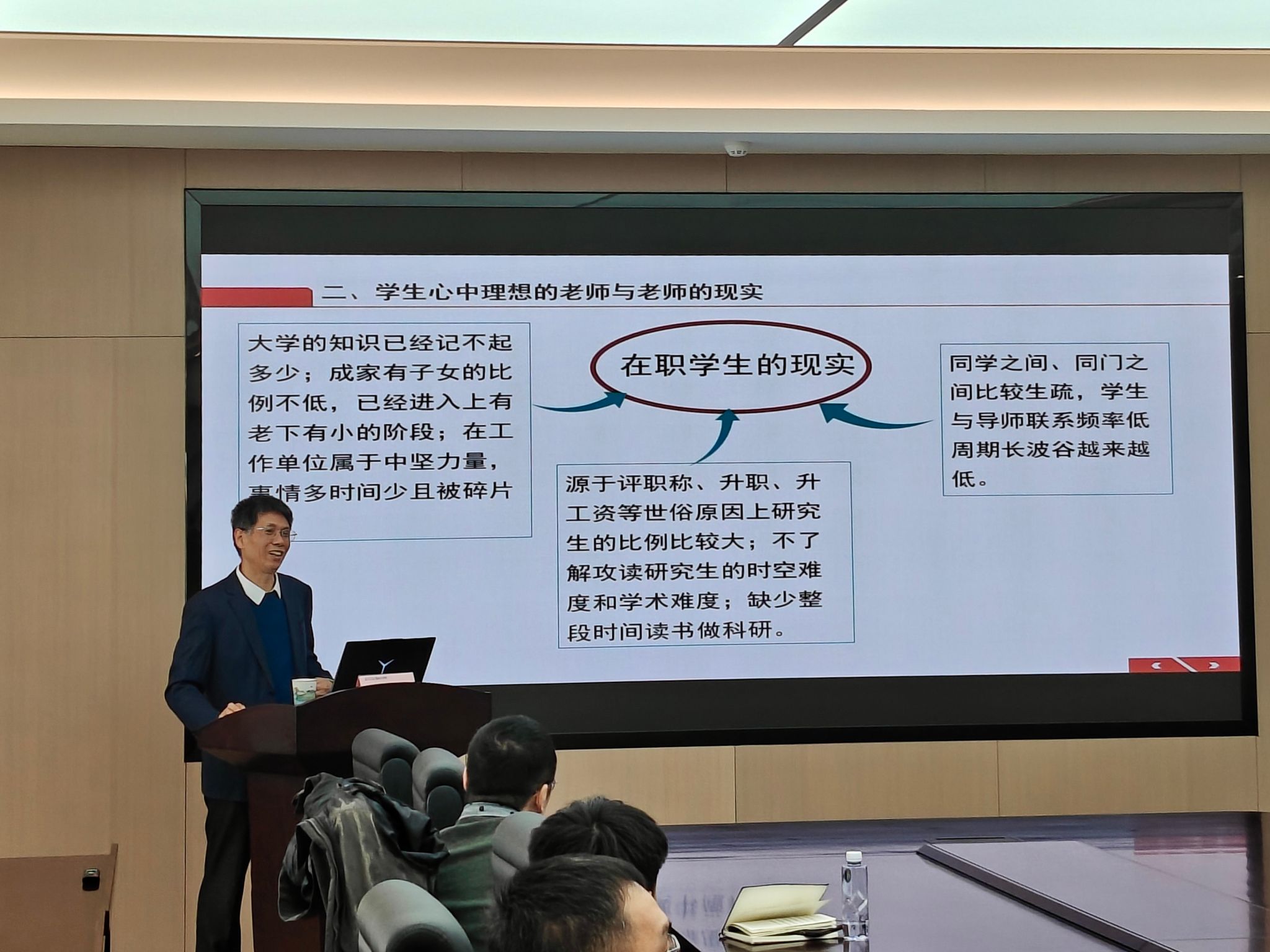 此次邀请到西北工业大学马克思主义学院丁社教教授作《导师修炼之道》专题讲座。丁教授从导师理想与学生现实的差距切入,指出导师应在学校七项行为规范框架下履行"学业与人生"导师的双重责任。他提出构建"教学相长"的师生关系,倡导导师如"脚手架"般平衡学术引领与学生自主性,建立人格平等的对话关系,并在保持边界的同时提供个性化培养与情感支持。丁教授系统阐述了"五要五不要"实践原则:要舍得投入、严格治学、关心学生、保留痕迹、把握边界;不要情绪化、公私不分、侵犯权益、越俎代庖、为师不尊。他还分享了通过坦诚沟通、项目促进和时空管理等实现精细化指导的具体方法。整场讲座为导师提供了一套系统实用的"修炼"指南,对提升研究生培养质量具有重要指导意义。