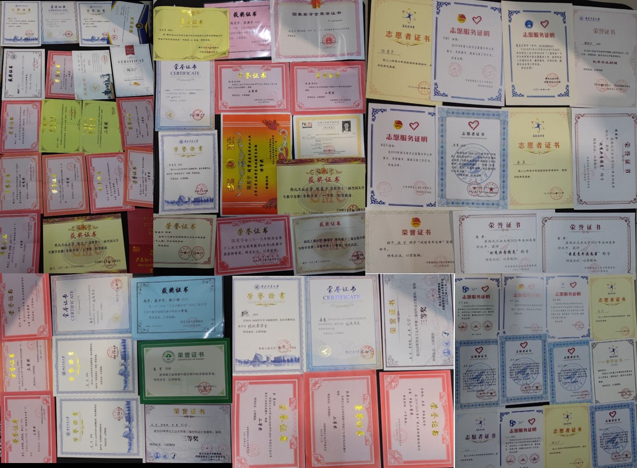 所获荣誉:2019-2020年度国家奖学金,第十二次陕西省高等数学竞赛特等奖,第十一届全国大学生数学竞赛一等奖,第十二届全国大学生数学竞赛一等奖