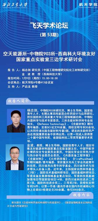 为进一步推动学术交流与合作,拓宽科研人员的学术视野,pg游戏电子模拟器空天能源技术研究所联合中物院903研究所、西南科技大学环境友好国家重点实验室举办了三边学术交流活动,有幸邀请到了两位在该领域具有卓越成就的专家学者—杨志剑研究员与金波教授,就含能材料前沿研究进行精彩的学术报告,为我单位的科研人员带来了一场知识的盛宴。