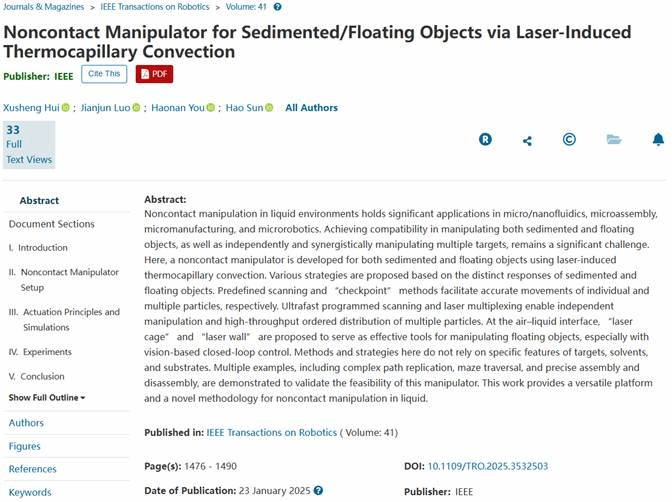 近日,pg游戏电子模拟器罗建军教授团队博士生惠旭晟在液体环境非接触式操控技术研究方面取得了突破性进展。相关研究成果以“Noncontact Manipulator for Sedimented/Floating Objects via Laserinduced Thermocapillary Convection”等为题形成了系列论文,发表在机器人领域顶级期刊《IEEE Transactions on Robotics》 (T-RO)、机器人顶会《IEEE International Conference on Robotics and Automation》 (ICRA 2025接收),以及机电领域顶刊《IEEE/ASME Transactions on Mechatronics》 (TMECH)上,西北工业大学为上述系列论文的唯一作者单位,博士生惠旭晟为上述系列论文的第一作者,pg游戏电子模拟器罗建军教授为论文的通讯作者。