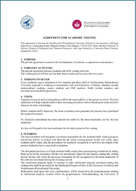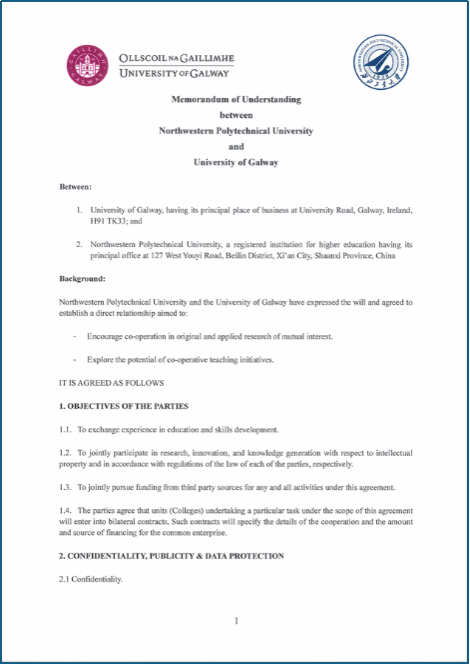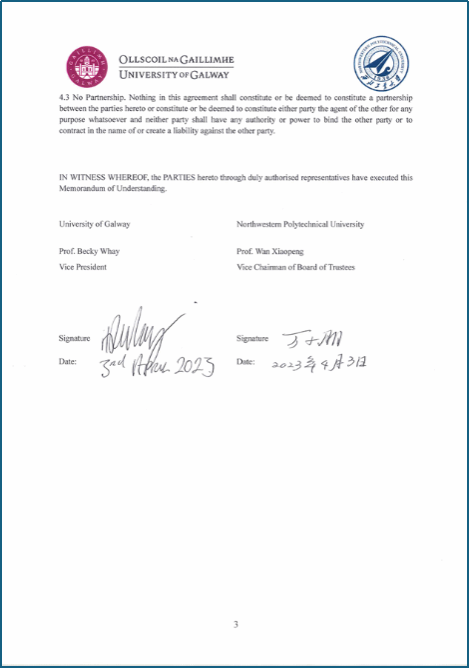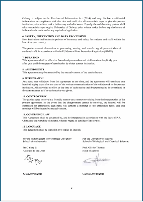 爱尔兰高威大学与西北工业大学有着良好的合作基础,双方于2023年签署战略合作协议,并开展高层领导互访,师生交流,暑期游学,合作科研等项目。以下为两校战略合作协议首页与末页。