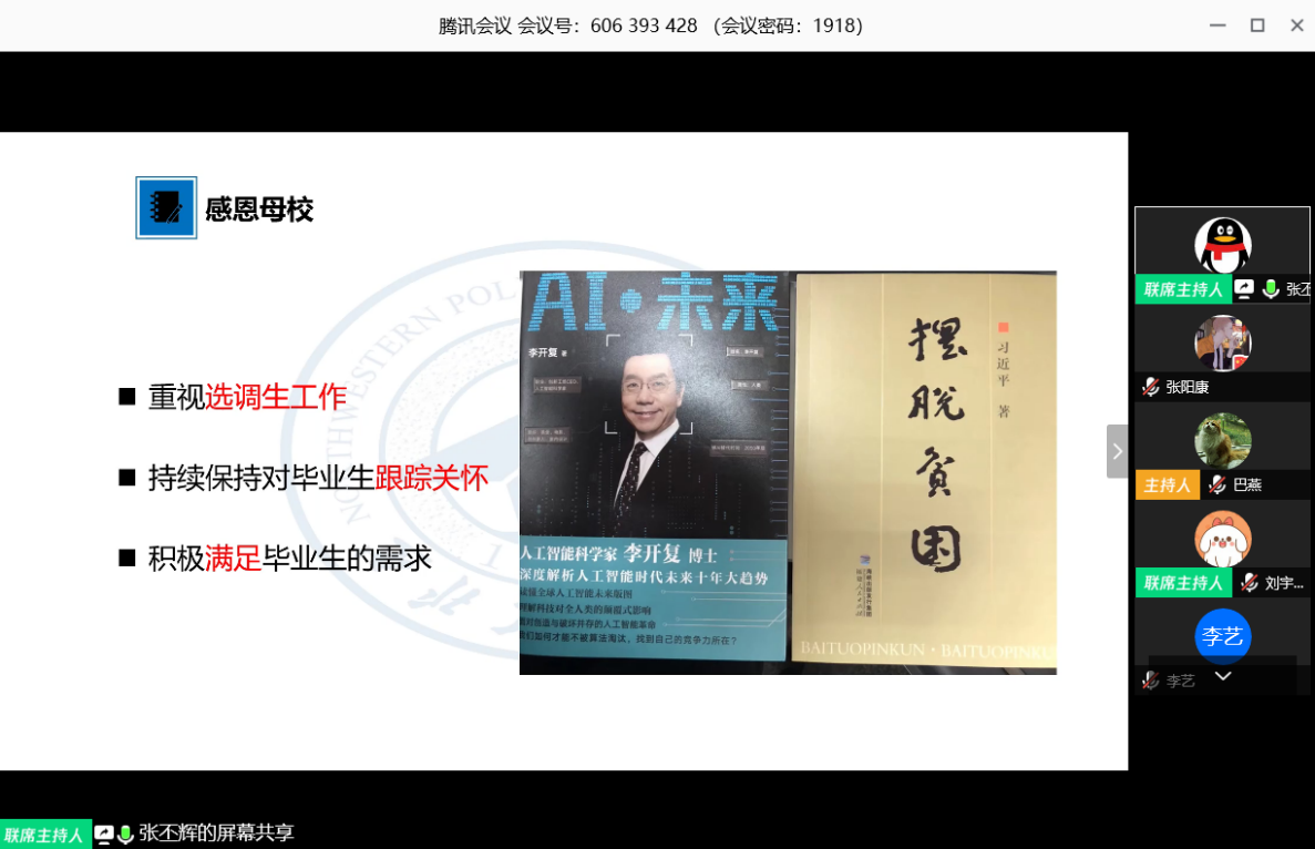 张丕辉从什么是选调生,为什么选择选调生,选调生的工作内容以及个人体会四方面进行介绍,为大家解读了选调生的政策,以及当时报考选调生的一些考虑。当介绍到当时为什么报考选调生时,张丕辉自豪的说到:“相比于哲学家们寻求方法‘解释世界’,我更愿意走向乡野,投身实践,读无字书,进百家门,行万里路,参与改变世界”。尽管在选调生的工作中,会碰到各种各样的问题。但张丕辉始终感念母校的培养和往日老师的教导,始终相信母校的培养和关怀能带给他解决问题迎难而上的信心和力量。在分享过程中,他也将这种信心和力量传递给了“现场”的每一个人。