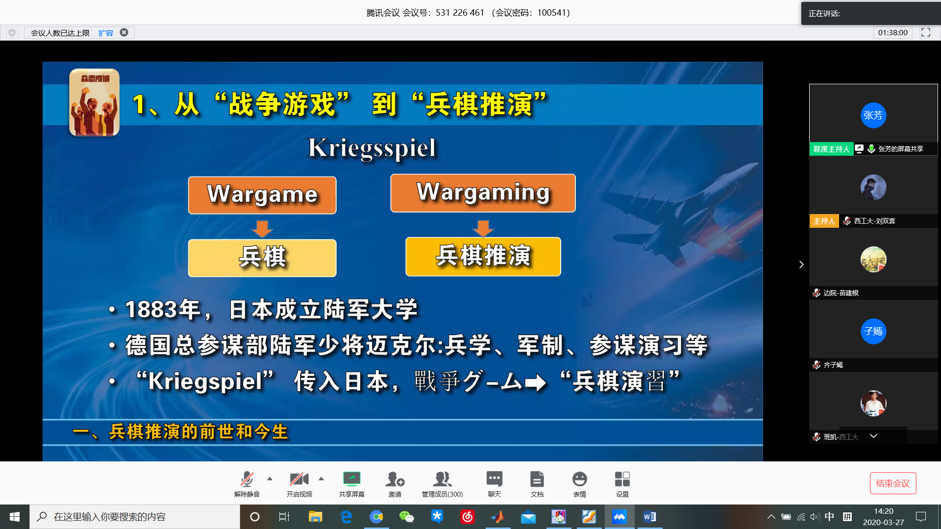 为深入贯彻落实国家国防教育办公室下发的《2020年全民国防教育工作安排》(国动教育﹝2020﹞1号)有关内容和要求,进一步提升陕西省兵棋推演比赛项目的科学化、整体化水平,助力我省国防教育工作广泛、深入、持久地开展,3月27日14:00,我校通过腾讯会议举办了西北工业大学2020年国防教育活动月主题报告会,火箭军工程大学张芳大校受邀作了题为《兵棋推演—让你了解未成形新技术潜力的有效工具》。本次报告吸引了150余名工大学子以及来自西安交通大学、西安理工大学、北京科技大学、北京化工大学、中北大学、边海防陆军学院、航天一院等军地院校共计300名师生齐聚云端。会议由pg游戏电子模拟器党委副书记王强主持。