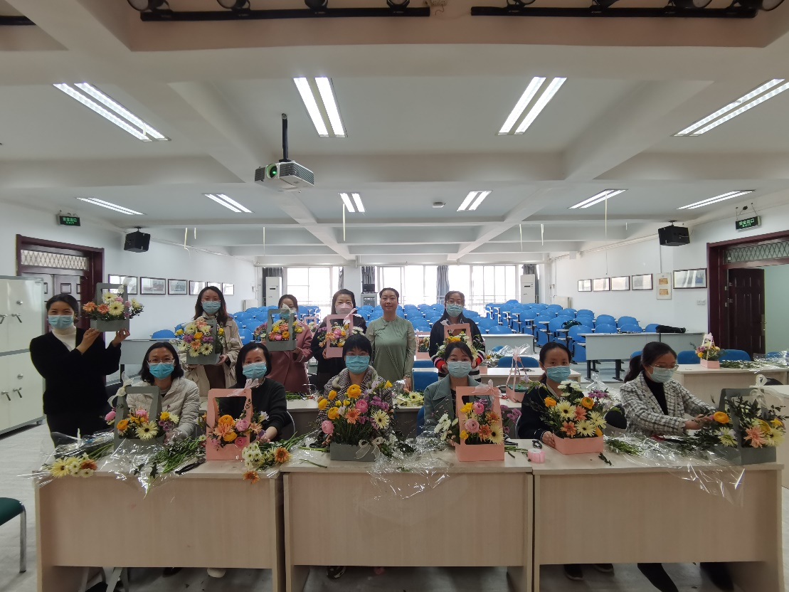 活动特邀插花老师为女教职工进行培训。活动中,插花老师为大家详细讲解了插花花材的识别、色彩的搭配、东西方插花特点等方面的知识,并现场进行了插花展示,看到老师制作完成的精美作品之后,大家兴致盎然,纷纷跃跃欲试。