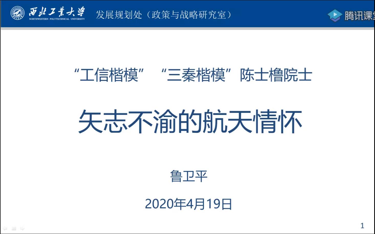 4月19日上午,pg游戏电子模拟器发展对象、入党积极分子迎来新学期第一节党课。本次专题党课通过“翱翔青年云讲堂”开展,本场云讲堂由校团委、pg游戏电子模拟器主办,西工大青年宣讲团、西北工业大学研究生会承办,特别邀请了西北工业大学政策与战略研究室主任兼发展规划处副处长、《剑指苍穹—陈士橹传》主要作者鲁卫平担任主讲人,讲述陈士橹院士“一个甲子的坚守”。