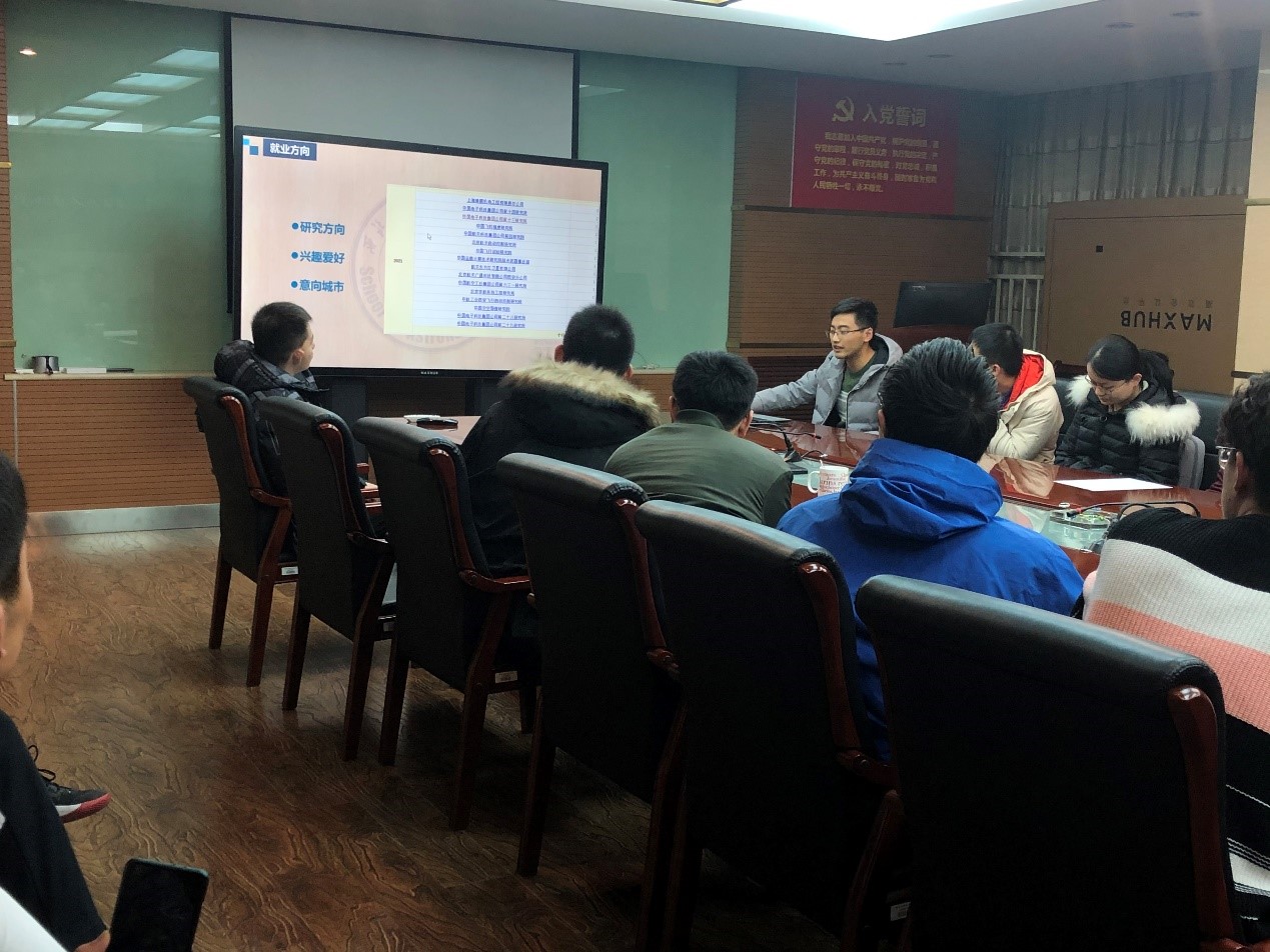 关于就业方面,来自两个支部的师兄师姐各展绝技,各出奇招,绘声绘色地向现场同学描述了就业过程的精彩故事。首先由张昊迪全面介绍毕业生们在就业时可能面临的多种选择,分别介绍了各大研究院所的招聘情况。王新亮结合本专业求职方向、求职前期准备以及求职中的笔试面试等问题,依次为同学进行详细说明,并强调数学成绩在求职中的重要性,勉励同学们要努力做到科研竞赛两不误,软件硬件都掌握,做一个全面型人才。汪佩分别从个人视角和单位视角对求职中涉及的面试问题进行了深度剖析,并结合自己的求职经历对各大城市专业对口的研究所进行了简要介绍。赵小涵与大家分享了自己从投递简历到签约单位的全部经历,以及其中的困难和收获,她认为找工作过程中最重要的就是要摆正自己的心态,忠于内心的选择。最后卢嘉琦对北京的研究院所进行了详细介绍,鼓励大家尽早做好人生规划,明确奋斗方向。