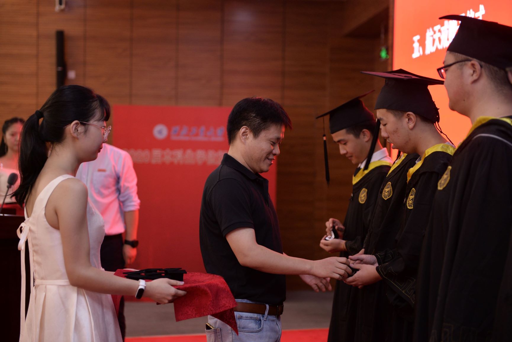 随后,pg游戏电子模拟器领导、各研究所所长、班主任为每一名毕业生赠送了“航天戒”。pg游戏电子模拟器寄情于物,将“公诚勇毅”的校训与“航天精神”相结合,推出“天之爱”系列毕业戒指。本科银色戒指,纯粹、简洁,象征着初出茅庐未经打磨的航天学子,这枚戒指将带着师长“勿忘初心”的叮咛和大家对实现航天梦的承诺,伴随着每一名2020届本科毕业生在新的岗位上不断前进。