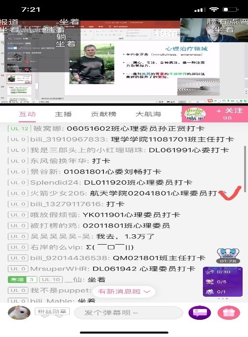 整个直播过程一个多小时,大家线下互动,畅所欲言。有心理委员说:“通过这次培训学习,知道了该怎样调节自己的情绪,使自己保持良好的心态和生活状态,对于今后如何指导同学们的心理健康也有了方向。”