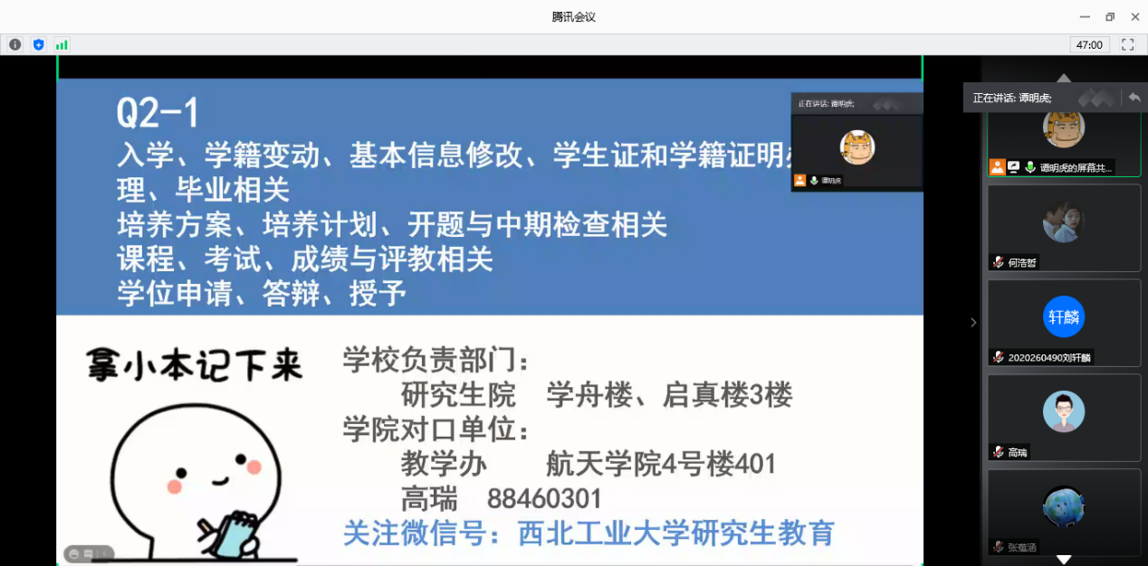 随后,研究生辅导员谭明虎老师为同学们详细介绍了学院办事指南,并分享了研究生生活和注意事项,希望同学们遇到问题及时与学院沟通。研究生教学主管高瑞老师为同学们介绍了培养计划制定和选课流程,并认真回答了同学们提出的相关问题。研究生会主席徐安帮为同学们介绍了学院研究生会的基本情况,展示了航天学子们积极向上的精神风貌与丰富多彩的课余生活,鼓励同学们在努力学习、认真科研的同时,积极加入研究生会,参与研究生会组织的各项活动,共同构建和谐校园文化环境。